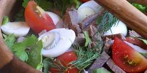 Листья салата порвать руками. все ингридиенты переложить в салатницу, аккуратно перемешать, посыпать мелко порезанной зеленью и полить заправкой.