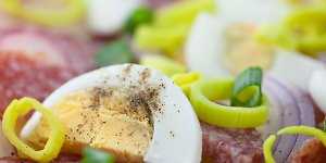 Все хорошо перемешать и полить салат приготовленным соусом, украсить кружками вареных яиц.