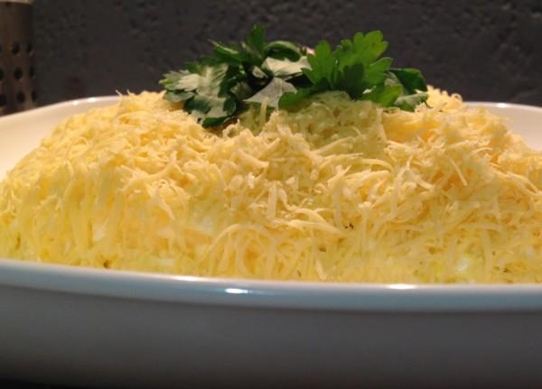 Последним слоем выложить сыр (покрыть сыром вверх салата и бока тоже).