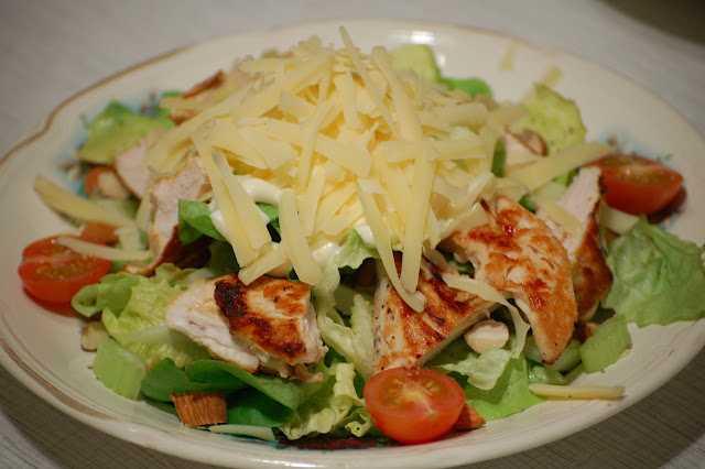 Готовую грудку разрежьте на небольшие кусочки и выложите на салат. В центр выложите пару ложек майонеза, а на него - натертый на крупной терке сыр, украсьте блюдо помидорами черри и немедленно подавайте.