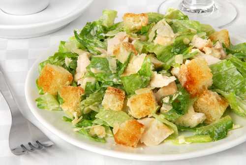 Листья салата помойте, порвите руками и выложите в салатник. Сверху выложите кусочки куриного филе. На филе выложите сухарики и полейте салатной заправкой. Посыпьте сыром, натертым на крупной терке.