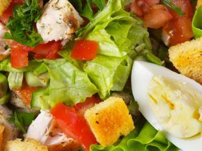 Сварить вкрутую яйца, нарезать кубиками, салат - полосками.