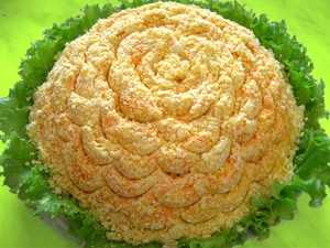 Поверхность салата посыпьте желтком, смешанным с оставшейся куркумой. Краем столовой ложки нанести на поверхность салата рисунок, имитирующий лепестки одуванчика. Поставьте салат на несколько часов в холодильник.