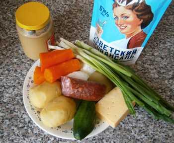 Также режем морковь, яйца, огурчик, сыр и колбасу.