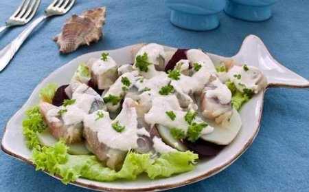 Приготовить заправку, соединив сметану, хрен, соль, молотый черный перец. Этаж салата относительно равномерно выложить заправку.