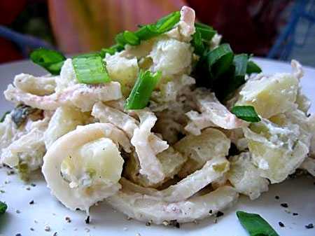 Филе кальмаров положить в кипящую воду, добавить зелень и варить не более 3 минут, остудить, очистить от кожи и нарезать соломкой. Отварной картофель почистить и нарезать кубиками.