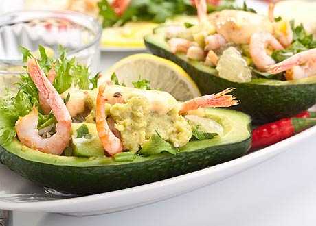 Авокадо разрезать пополам, вынуть косточки, очистить мякоть , а лодочки оставить. Мякоть авокадо порезать мелкими кусочками и полить лимонным соком. Яйца и петрушку мелко порезать. Отварные креветки можно не резать, кому как нравится.
