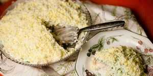 Кладем сыр следующим слоем и тоже смазываем майонезом. Разминаем рыбу вилкой.