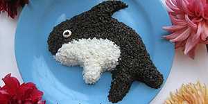 Салат выложить на плоскую тарелку в виде дельфина. Яичные белки и маслины мелко-мелко нарезать и украсить салат. Глазик сделать из капли майонеза и маленького кусочка оливки.