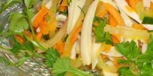 Отварить кальмаров, остудить и нарезать соломкой. Я закладываю их в кипящую воду, довожу до бурного кипения и сразу вынимаю.