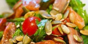 Разложите салат по тарелкам, добавьте нарезанную небольшими кусочками рыбу, полейте остатками заправки и сдобрите семенами тыквы, слегка обжаренными на сухой сковороде. Времени на все про все уходит не больше 15 минут – идеальный вариант для летнего обеда.