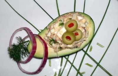 Смешайте ингредиенты хорошо и заполните авокадо, полейте авокадо лимонным соком, чтобы оно не стало черным. Сверху положите оливки с перцем.