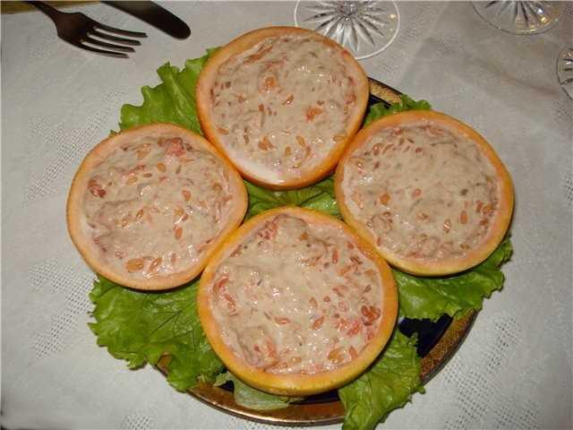 Выложить массу в половинки грейпфрута и поставить их на листья салата. Подавать салат охлажденным.