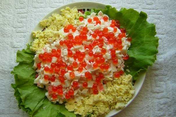 Кальмары и яйца нарезать соломкой и смешать с измельченными крабовыми палочками (креветки добавляются целиком), красной икрой (1-2 ложки оставить для украшения), заправить майонезом.