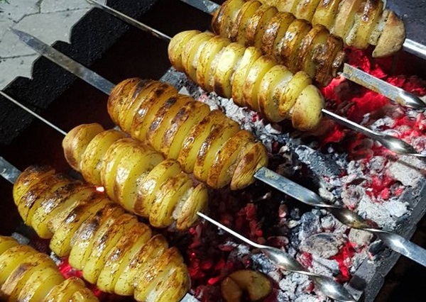 Выкладываем шашлык на мангал и в обернутом виде готовим примерно 30 минут, все зависит от сорта картофеля. Через полчаса снимаем фольгу и снова отправляем шашлычок дожариваться минут 10. Это невероятно вкусно, советуем попробовать.