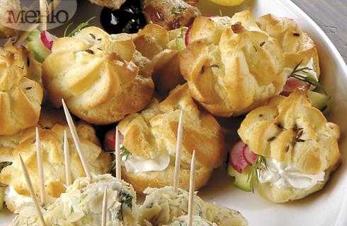 1. В кастрюлю поставить кипятить воду, молоко, масло и соль. После того как все закипит, растопить сливочное масло, добавить муку, постоянно помешивая деревянной лопаточкой или деревянной ложкой. Когда вы сформируйте тесто в шар, снять с огня. Перенесите тесто в миску. Когда немного остынет, но это все еще будет довольно теплым, добавить яйца по одному, постоянно мешая деревянной лопаточкой или миксером с тестомесом. Любое последующее яйцо добавляется, когда предыдущее полностью размешается. Из теста с помощью шприца или ложки сделать маленькие цветочки или крендели. Посыпать тмином, если это необходимо. Выпекать на листе выпечки при 230 ° С около 15 минут до золотистого цвета. Дверца печи не должна быть открыта во время выпечки. Как только они будут готовы, убрать с духовки, охладить и разрезать на две половинки.