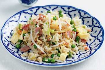 Добавить холодный рис, бобовые ростки, 1 столовую ложку соевого соуса, нарезанные яйца и жарить от 3 до 5 минут или пока рис не прогреется и горох не станет мягким. Приправить белым перцем. Подавать сразу же.