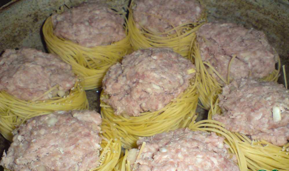 «Гнезда» из макарон с начинкой — вкусное, сытное и красивое блюдо! Причем, начинка может быть абсолютно любой: грибы, морепродукты, тушеные овощи, мясной фарш...