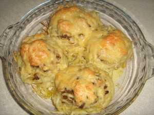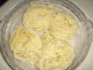 Третий вариант. В неглубокую посуду поместите «гнезда», налейте немного воды, посолите, накройте крышкой и на небольшом огне доведите их до готовности. Затем выложите их в смазанную маслом форму для запекания, разложите начинку (можно посыпать зеленью и тертым сыром) и поставьте на 10 минут в духовку, разогретую до 180 градусов.