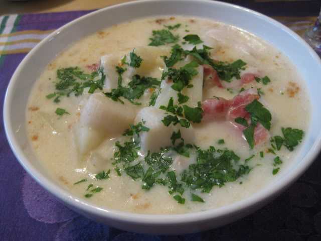 Бекон мелко нарезать. Все овощи, кроме картофеля, нарезать мелкими кубиками; картофель - средними кубиками. Бекон обжарить в оливковом масле до румяной корочки. Добавить овощи и жарить, постоянно помешивая, на среднем огне 10 минут. Всыпать муку, размешать и жарить еще 7 минут. Разложить все в горшочки, влить рыбный бульон и всыпать картофель. Добавить нарезанное крупными кубиками филе лосося, крабов и очищенных креветок и готовить 10 минут. Влить доведенное до кипения молоко