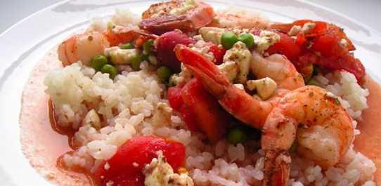 Предварительно разогрейте духовку до 300 градусов. В неглубокую сковороду добавьте оливковое масло, мелко порезанный лук и поджарьте в течение 2-4 минут. Добавьте мелко порубленный чеснок, хорошо перемешайте. Помидоры порежьте кружочками, добавьте к уже поджаренной лука с чесноком. Пусть эта смесь покипит в течение 7-10 минут, пока не выкипит немного жидкость из помидоров. Снимите с огня. В кастрюлю нужно выложить помидорно-луковую смесь, добавить креветки, сыр, соль, перец по вкусу. Поставьте запекаться в духовку на 10-15 минут. Перед подачей на стол посыпьте обильно зеленью. Можно подавать как гарнир к рису, макаронам или просто употреблять с итальянским хлебом.