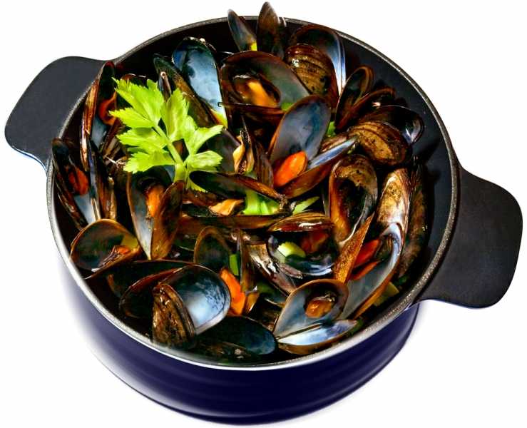 Лук, чеснок и перец болгарский нарезать мелкими кубиками и обжарить в оливковом масле. Добавить белое вино и слегка упарить. Затем положить мидии и готовить 5-10 минут. Подавать горячими, посыпав мелко нарубленным базиликом и украсив по вашему вкусу.