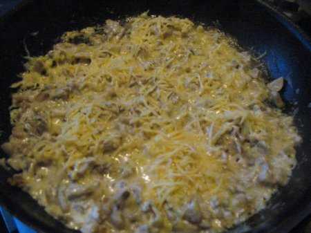 Тушить в течение 15 минут. Добавить в сковороду половину натертого сыра, перемешать. Сверху посыпать оставшимся сыром и поместить в нагретую до 200 градусов духовку, запекать до образования румяной корочки.