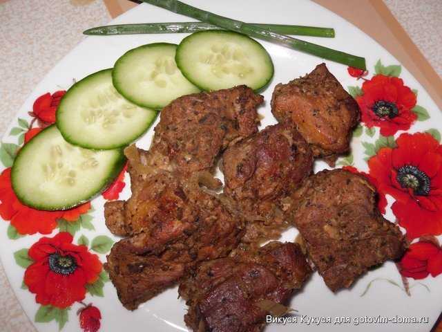 Маринованный лук в виде подушки пропитывает мясо своим ароматом и вкусом, мясо вначале слегка тушится,