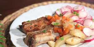 Добавить примерно 1/2 стакана воды, закрыть горшочек крышкой и поставить в предварительно прогретую до 210С духовку примерно на 1 час (можно и на полтора часа, это уж дело вкуса). Все, ребрышки с овощами и вкусным соусом готовы, можно есть (и облизывать пальцы).