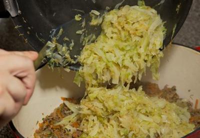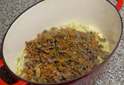 - Вторым слоем нашего блюда будет фарш. Поэтому его будем выкладывать в кастрюлю сверху тушеной капусты так, чтобы он полностью покрывал ее. Столовой ложкой разровняйте наш ингредиент равномерно по поверхности первого слоя.