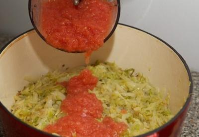 - Берем емкость с томатным пюре и выливаем его в кастрюлю на третий слой. Накрываем наполненную кастрюлю крышкой и ставим вариться на средний огонь в течение 30-35 минут.