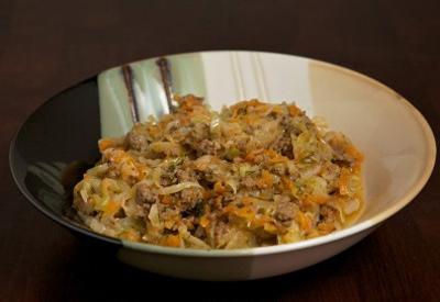 - По истечении этого времени наше блюдо будет готово. Внимание: время от времени ленивые голубцы можно аккуратно помешивать ложкой.