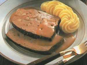 Печенку очистить от пленок, нашпиговать кусочками сала, как филе, положить в кастрюлю с маслом и подрумянить с всех сторон. Залить вином, положить приправы, посолить. Накрыть крышкой и поставить в духовку. Тушить, поливая соусом. Готовую печенку нарезать ломтиками, разложить на блюде и полить соусом, в котором она тушилась.