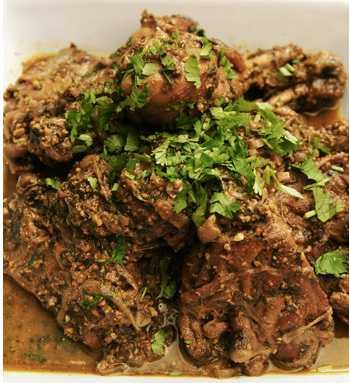 В кастрюлю с курицей добавьте лук и орехи, влейте вино, перемешайте и тушите на среднем огне без крышки 10 мин. Затем добавьте пряности и часть зелени, тщательно перемешайте, накройте крышкой и готовьте 20 мин. Перед подачей посыпьте свежей кинзой и петрушкой.