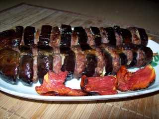 Теперь на деревянные шпажки надеваем колечко баклажана, шарик фарша, снова колечко баклажана, снова фарш и т. д.