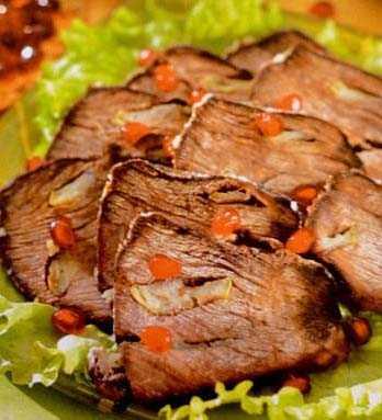Листья салата промойте, обсушите, разложите на блюде и выложите на него готовое нарезанное мясо, украсьте зернами граната и подавайте.