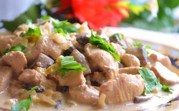 Вечером нарежьте на куски куриное филе и свинину, грибы – пополам, лук – полукольцами, сложите все в кастрюлю (лук — сверху), залейте все майонезом и поставьте в холодильник.