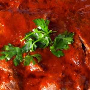 Довести соус до кипения в течение 10 минут и добавить мясо вместе с бульонным кубиком. Положить в духовку, чтобы приготовить мясо до готовности.