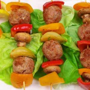 Мокрыми руками, замесить смесь и сделать 24 равных шариков. Пропустите их на шампуры, среди них можно нанизать кусочек лука или перца при желании.