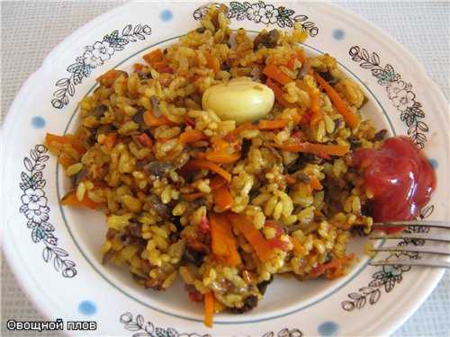 6. Берем стакан риса, промываем в 10 водах, чтобы водичка стала прозрачной, выкладываем к овощной смеси, перемешиваем хорошенько. Рис моментально впитает водичку, которая осталась в сковородке. Выливаем 1.5 стакана горячей воды в рис, закрываем крышку и убавляем газ.