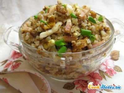 Гречневую крупу промываем, заливаем 2 ст. холодной воду и варим до выпаривания жидкости на небольшом огне. Лук мелко нарезаем и обжариваем до золотистого цвета. Грудинку нарезаем соломкой и добавляем к луку, слегка обжариваем. Далее добавляем грибы и пару минут обжариваем.