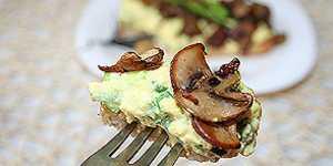 На тарелку положить поджаренный хлеб. На него положить толстый слой горячей яичницы. Сверху посыпать жареными грибами. Часть грибов положить на тарелку рядом с тостом. Подавать, пока яичница горячая.