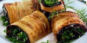 Подготовленную смесь уложите на баклажаны и сверните их трубочкой.