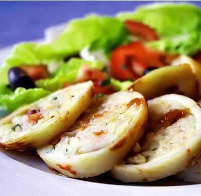 Половину лука обжарьте, затем добавьте к нему рис, щупальца кальмаров, половину помидоров и вина, соль, сахар и перец. Влейте 1 стакан воды и тушите до выкипания жидкости, периодически помешивая. Затем снимите начинку с огня и дайте ей остыть. Добавьте рубленую зелень.