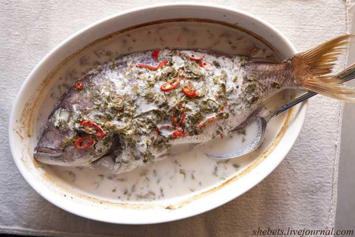 В брюшко рыбы влить столовую ложку соуса и сверху полить половиной кокосового соуса (можно влить в форму весь соус, а можно половину оставить для подачи).