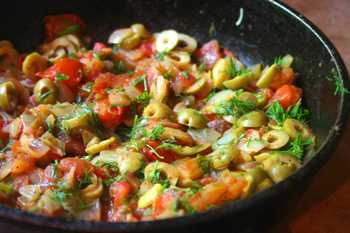 Лук мелко нарезаем, помидоры нарезаем кубиками. Оливки нарезаем кружками, зелень измельчаем. На растительном масле обжариваем лук, добавляем помидоры и тушим 5 минут.