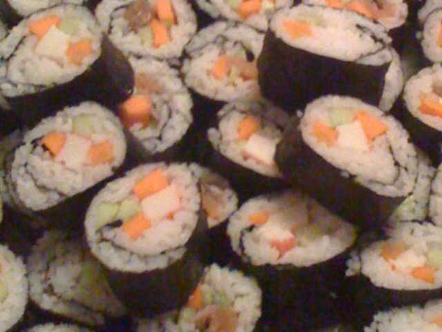 Водоросли разложить на бамбуковую циновку, а затем покрыть рисом. Внутрь положить нарезанную соломкой морковь, авокадо, огурец, тунец и лосось. Свернуть рулон и разрезать на меньшие рулоны острым ножом, смоченным в воде.
