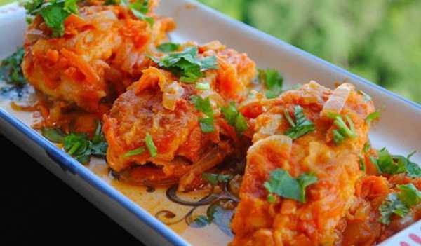 Выложить часть маринадной смеси на дно формы для запекания, сверху положить кусочки филе минтая, посолить и запекать в духовке 15-20 минут.