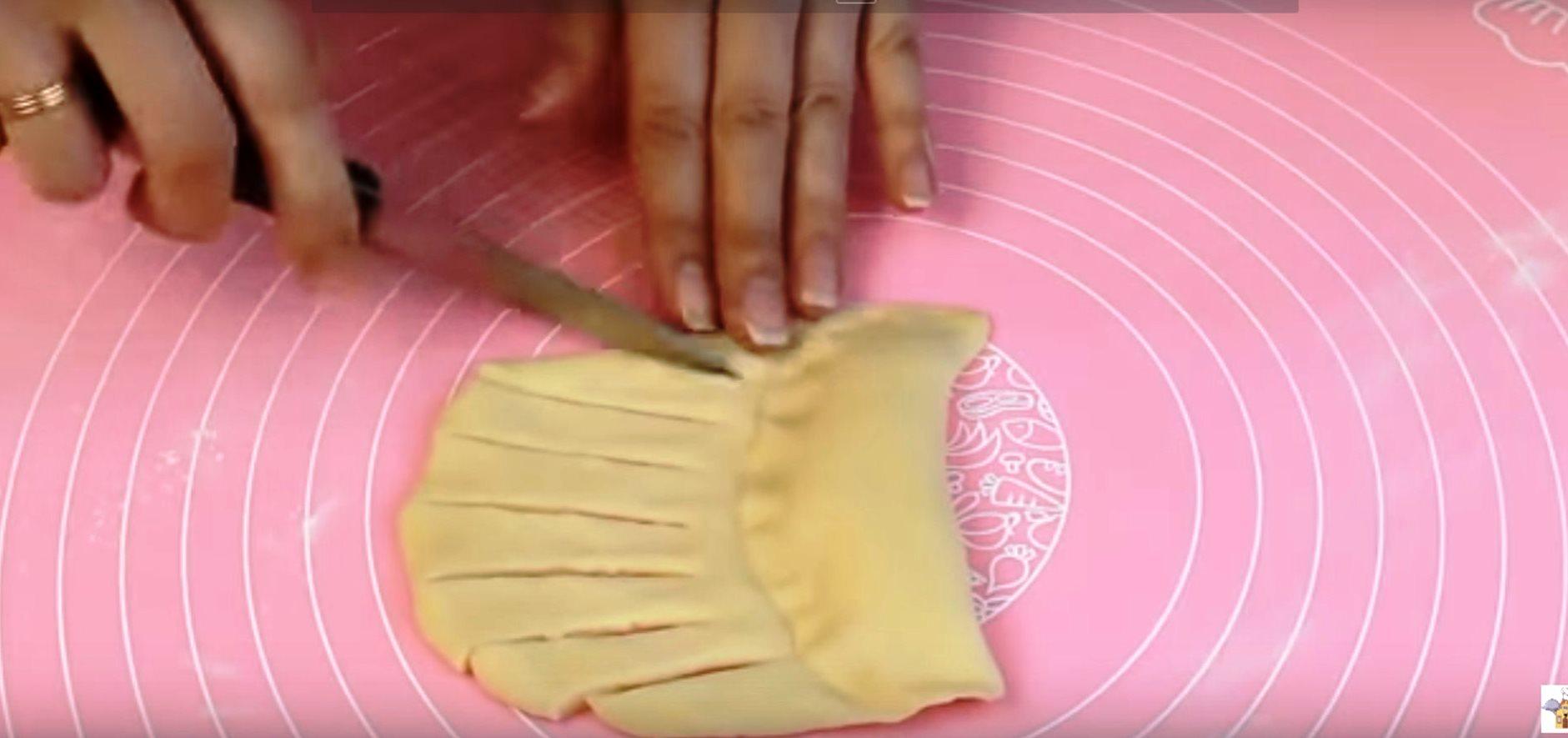 Теперь наше тесто готово к формированию булочек. Раскатываем его в жгут и разделаем на примерно равные части. Каждый кусочек теста раскатываем лепешкой около 12 см. На одну сторону выкладываем начинку, накрываем краем теста и защипываем. С другой стороны делаем надрезы и накрываем первую часть.