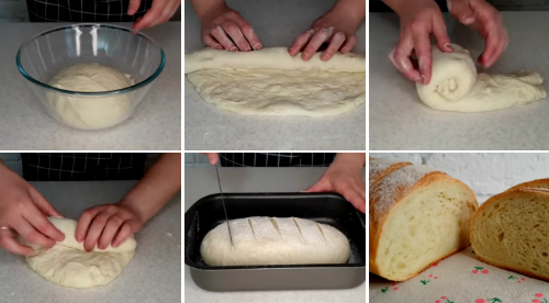 За это время оно увеличится в размере. Немного притрушиваем тесто мукой и выкладываем его на стол. Здесь мы его снова перетрушиваем мукой и сильно его не обминаем, а растягиваем в пласт и сворачиваем в рулет. По длине рулета сворачиваем новый рулет, растягиваем в пласт и последний раз делаем рулет и формируем батон. Форму для выпечки посыпаем небольшим количеством муки, переносим тесто, накрываем и оставляем еще на 20 минут.